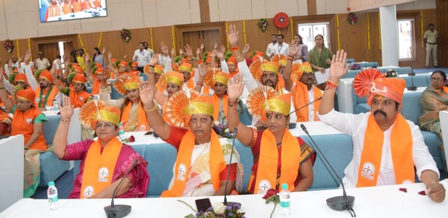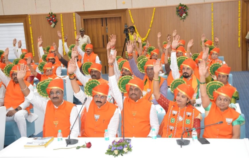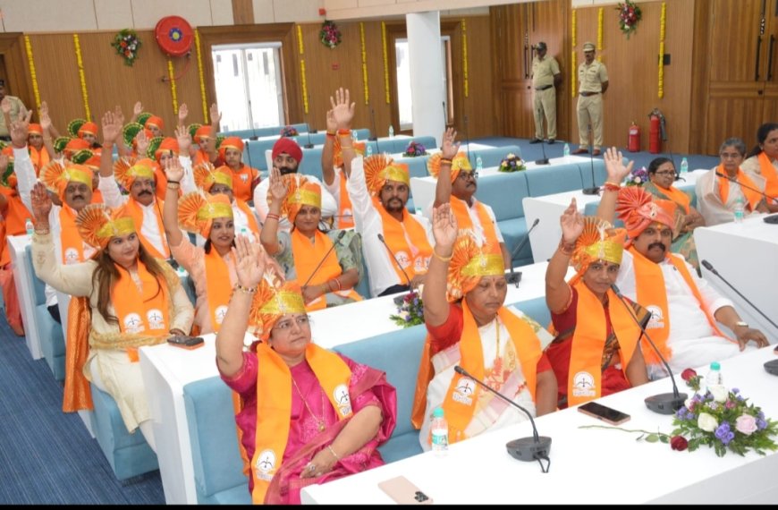 मोदी जॅकेट, भगवे फेटे, गळ्यात रुमाल घालून भाजपचे सर्व नगरसेवक, तर भगवे फेटे व गळ्यात भगवा रुमाल घालून शिवसेना शिंदे गटाचे नगरसेवकांचे एसी कोच बसवर भगवे झेंडे लावून सकाळी 11 वाजता आगमन झाले. यानंतर निळे फेटे बांधून वंचित बहुजन आघाडीचे 4 नगरसेवकांचे आगमन झाले. नवीन ओबेरॉय हे एकटे राष्ट्रवादी शरदचंद्र पवार पक्षाचे नगरसेवक एकटे दाखल झाले.