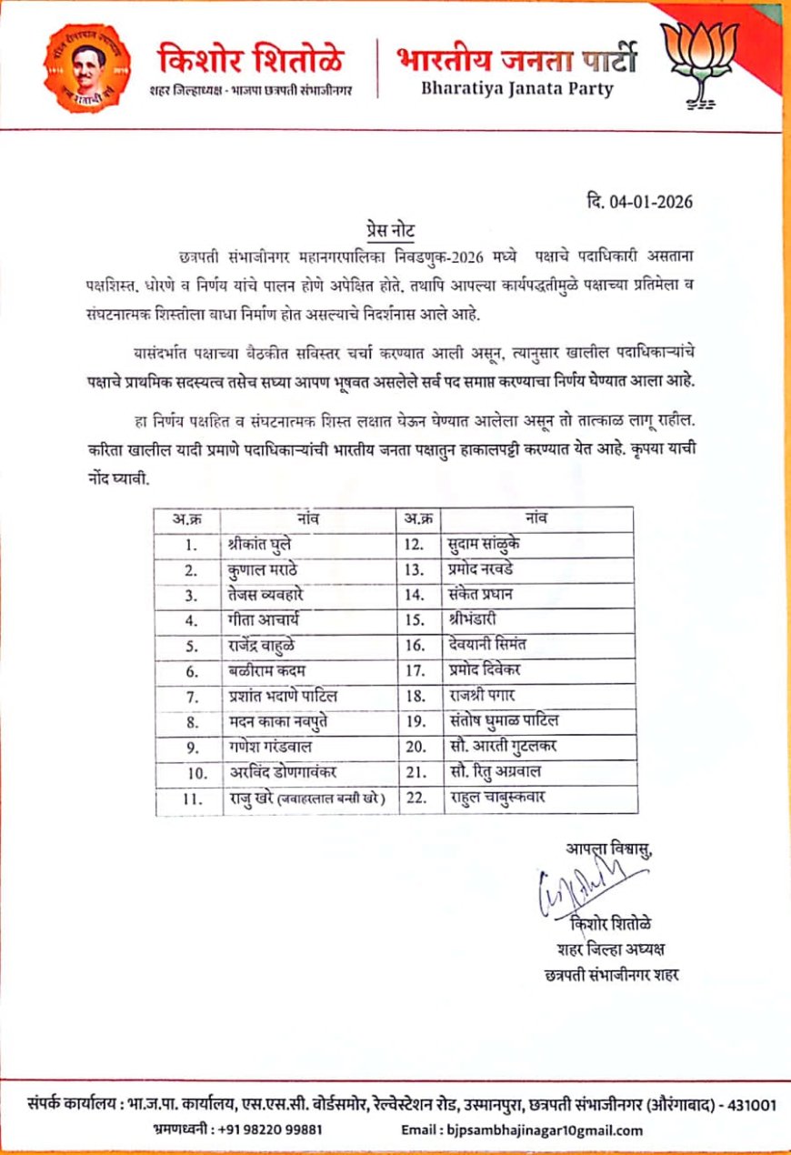 छत्रपती संभाजीनगर (औरंगाबाद), दि.4(डि-24 न्यूज) - छत्रपती संभाजीनगर महापालिका निवडणुकीसाठी सर्वच उमेदवारांनी प्रचाराला सुरुवात केली आहे. शिंदे सेना व भाजपा कडून काही इच्छूकांची संख्या जास्त होती तिकीट मिळाले नसल्याने काहींनी उमेदवारी अर्ज दाखल केला. काही उमेदवारांची समजूत काढून उमेदवारी अर्ज मागे घेण्यासाठी काही प्रमाणात नेत्यांना यश आले परंतु भाजपाचे 14 बंडखोरांनी आपले अर्ज मागे घेतले नसल्याने भाजपाच्या उमेदवारांची डोकेदुखी या निवडणुकीत वाढणार आहे. भारतीय जनता पार्टीचे शहर जिल्हाध्यक्ष किशोर शितोळे यांनी पक्षशिस्त मोडणा-या 22 कार्यकर्त्यांना पक्षातून निलंबित करण्याचा निर्णय घेतला आहे. प्रतिक्रिया देताना त्यांनी सांगितले पक्षाच्या शिस्तीचे उल्लंघन केले असल्याने त्यांच्यावर कारवाई केली आहे आता त्यांना पक्षात घेतले जाणार नाही. ते निवडून येणार नाही निवडून आले तरीही पक्षात त्यांना आता जागा राहणार नाही, पक्षशिस्त मोडने भारतीय जनता पार्टी खपवून घेणार नाही असे शितोळे यांनी सांगितले आहे. आता बंडखोर उमेदवार काय भुमिका घेतात याकडे सर्वांचे लक्ष लागले आहे.